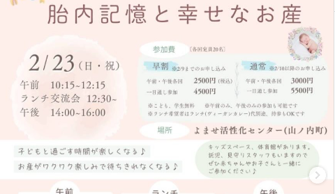 2/23、長野県山ノ内町でお話会をします 【お話会のテーマ】 「胎内記憶とゆるゆる子育てのお話」 胎内記憶を知ると、お子さんに対する気持ちが変わり、子育てが楽になります。 妊娠中に知ると、生まれる前、そして生まれてからの赤ちゃんへの接し方、向き...