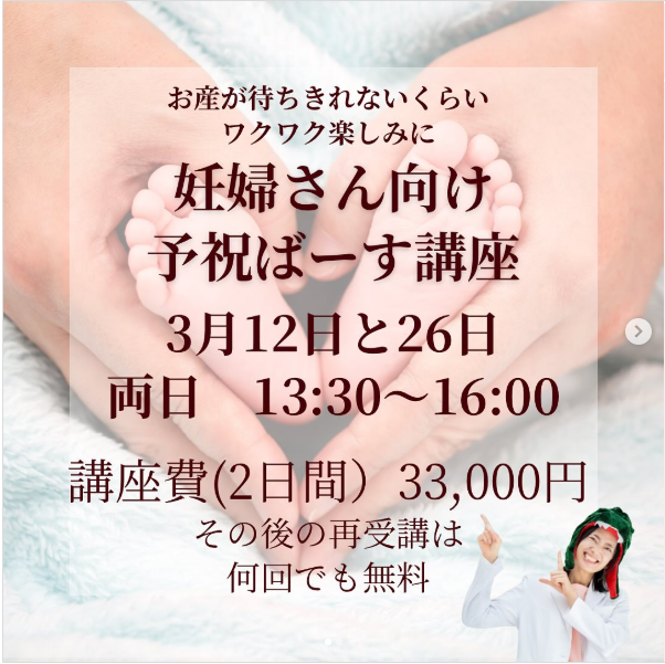🌸 予祝ばーす講師養成講座 オンラインで開催! 🌸 お産が「待ちきれないくらいワクワク楽しみになる!」をコンセプトにした、世界初のお産法 「予祝ばーす」ヒプノバーシング、胎内記憶、そして日本古来の 「予祝」 のエッセンスをギュッと詰め込んだ、ま... -